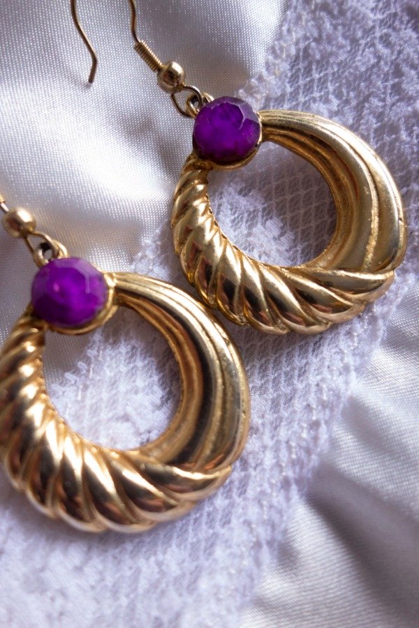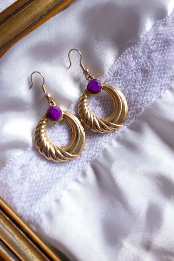 Aros vintage con baño dorado trabajado con un relieve torsionado y pieza encastrada strass violeta.