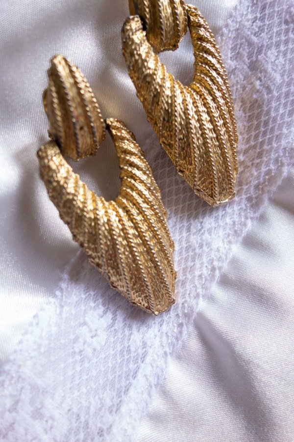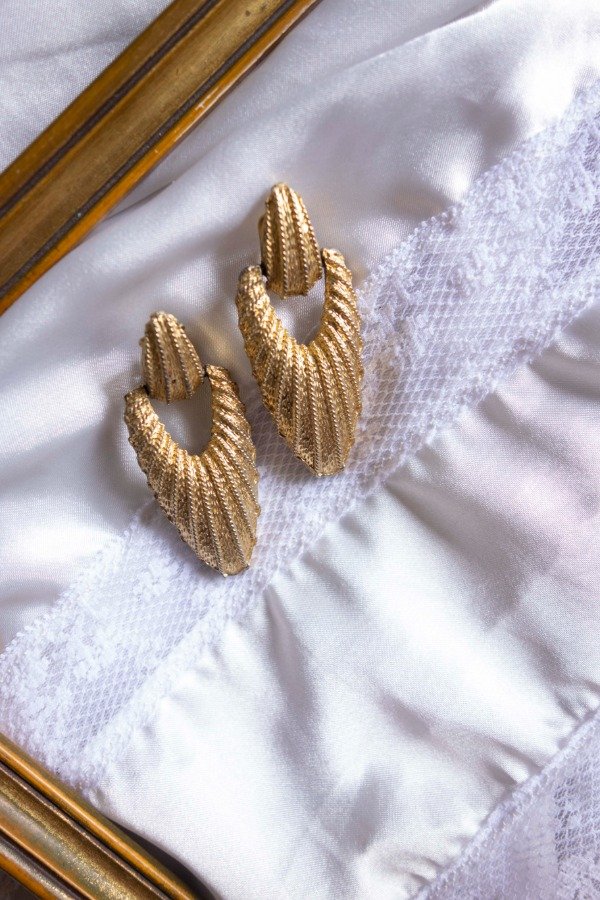 Aros tipo clip, metálico con baño dorado. Diseño alargado y curvo, trabajado en un relieve trenzado que combina líneas diagonales y textura.