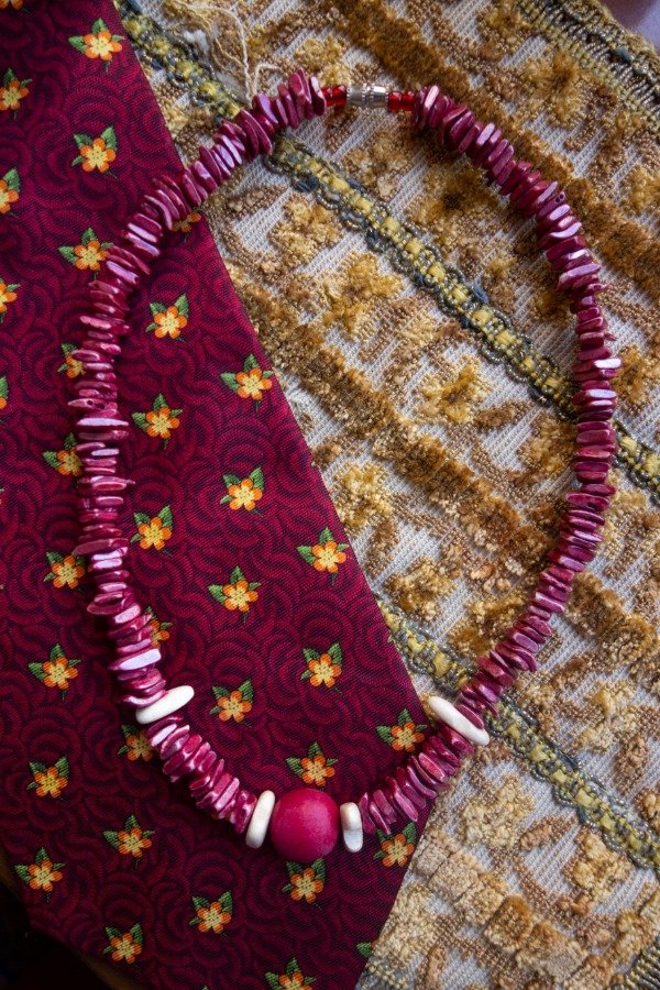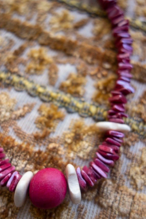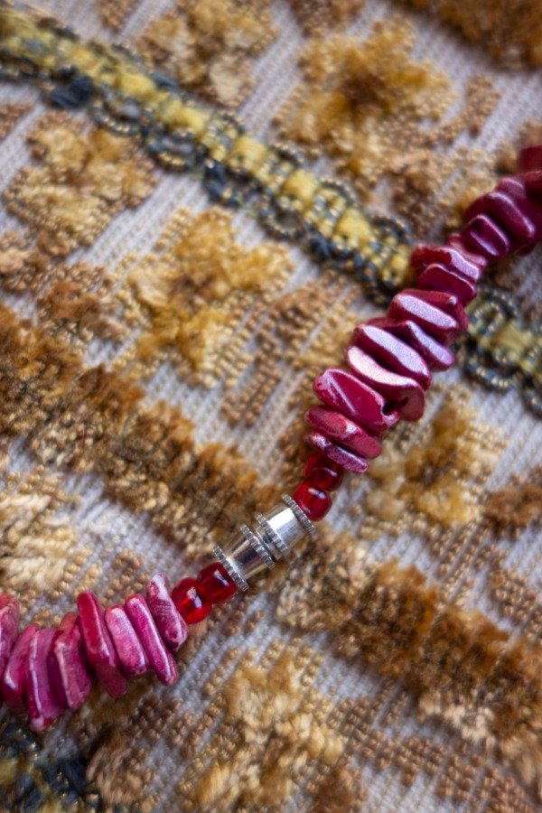 Collar gargantilla con piezas tipo caracol en tono fucsia.
