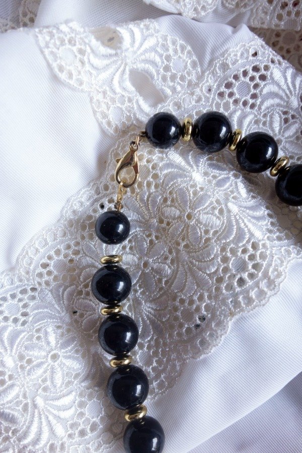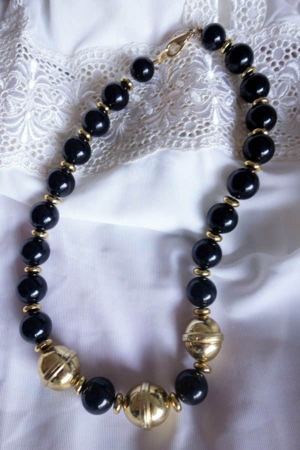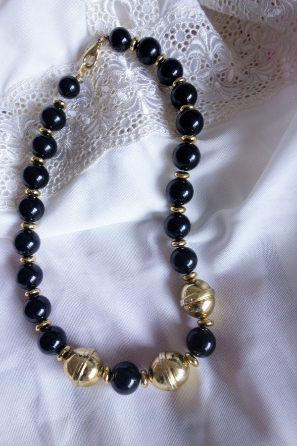 Collar tipo gargantilla con esferas negras pulidas de acabado brillante. Tiene separadores