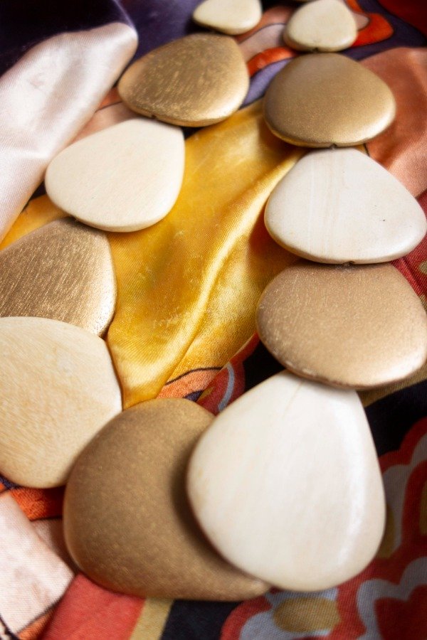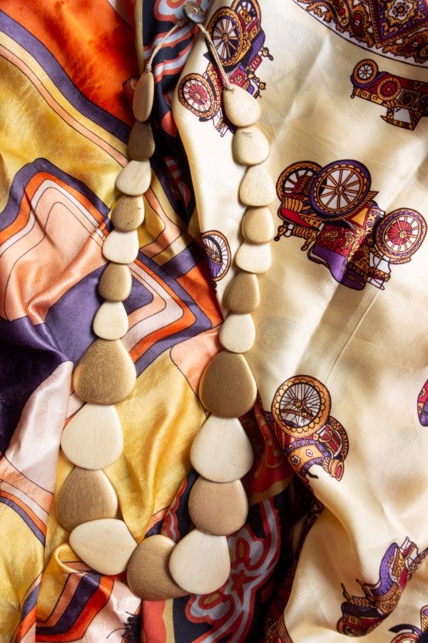 Collar con piezas de madera en tonos dorados, con un suave brillo.