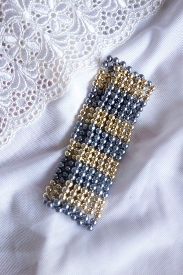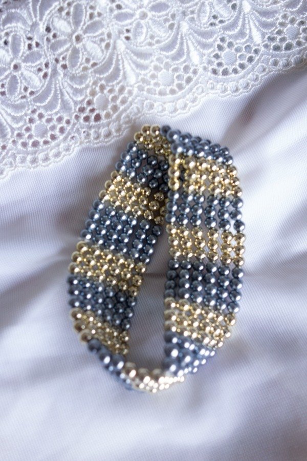 Pulsera elástica con seis filas de perlitas en tonos plata y dorado.