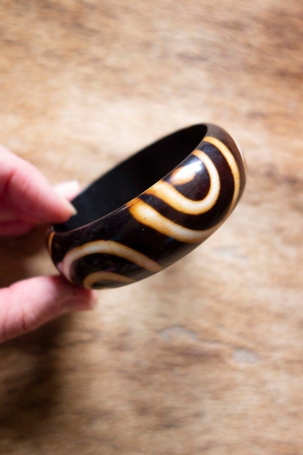Modelo 1- Pulsera de madera, con esmaltado brilloso. Color marrón oscuro con grabados en crudo. Diámetro 7cm