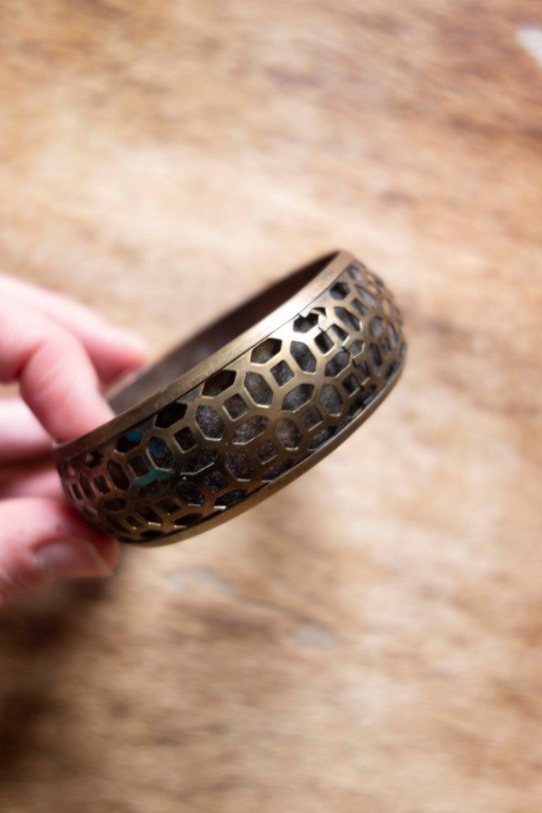 Modelo 3 - Pulsera metálica en tono bronce oscuro, con calado de formas geométricas. Diámetro 7cm