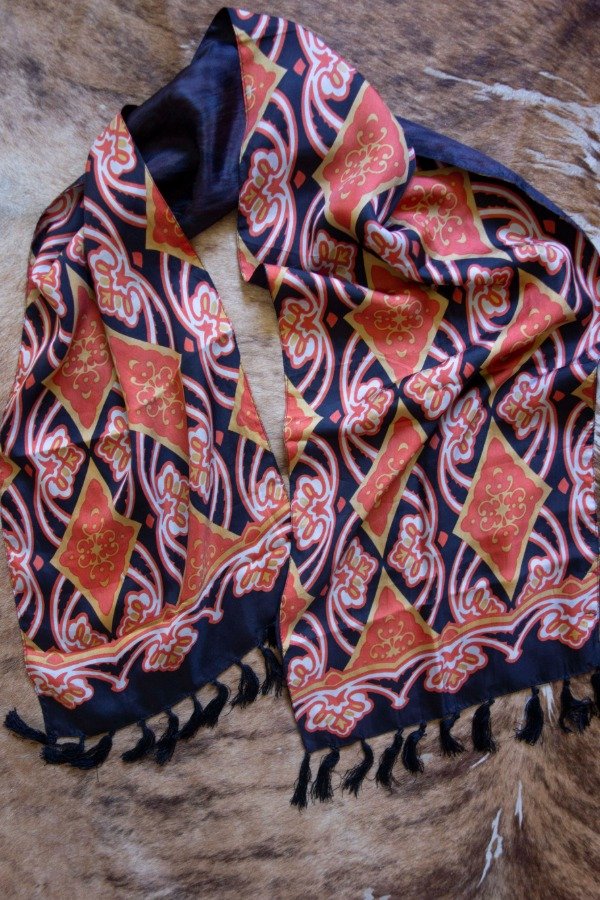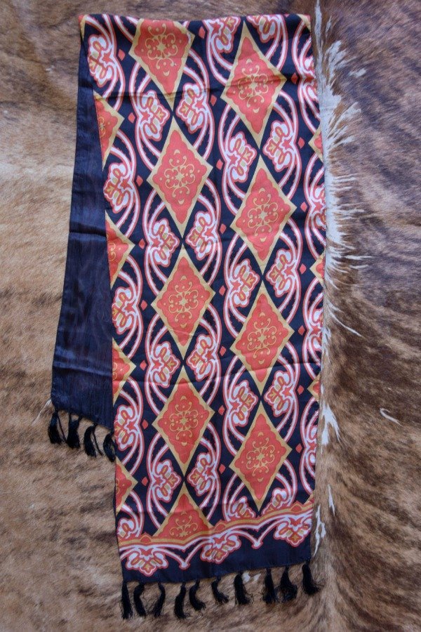 Pañuelo rectangular de seda estampado en tonos negro, amarillo y naranja.