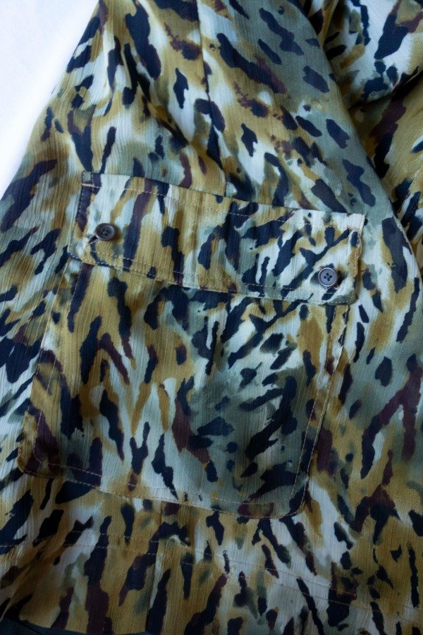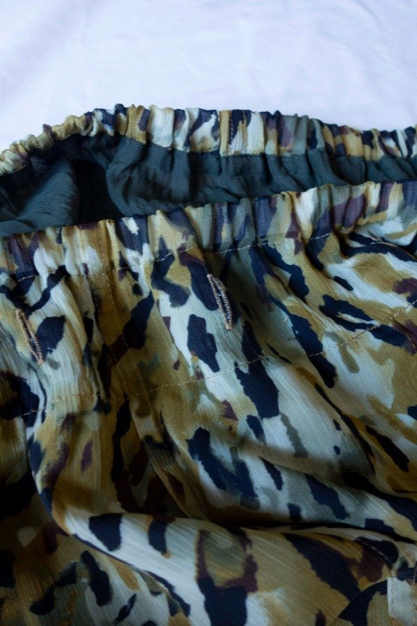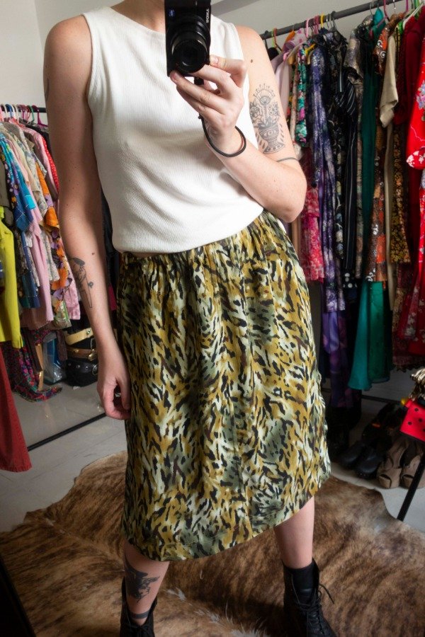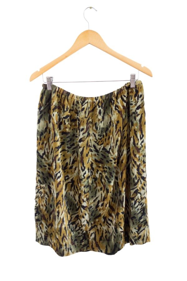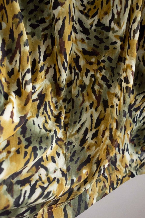 Falda de gasa estampada con animal print, forrada con gasa verde militar.