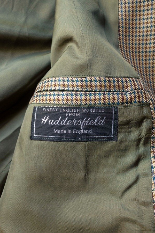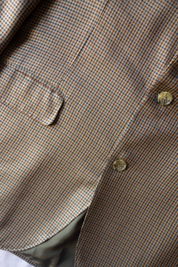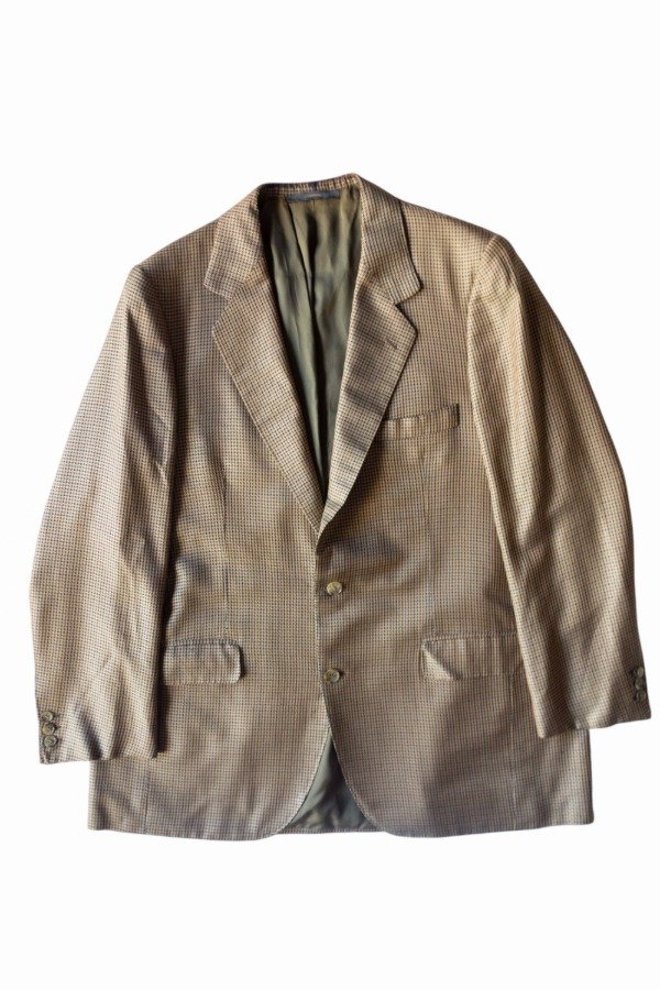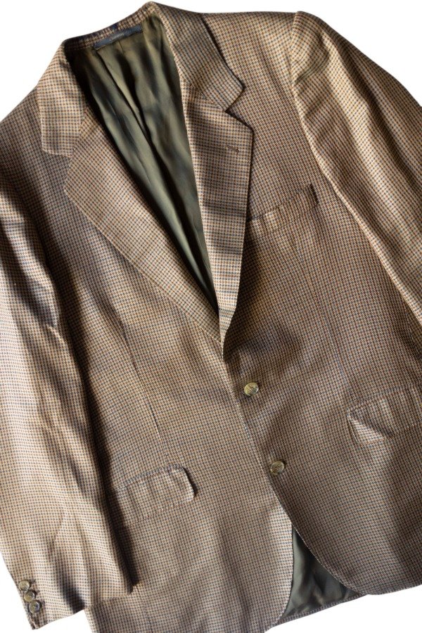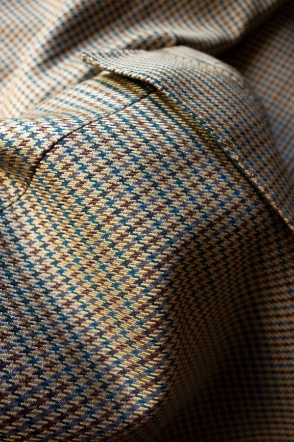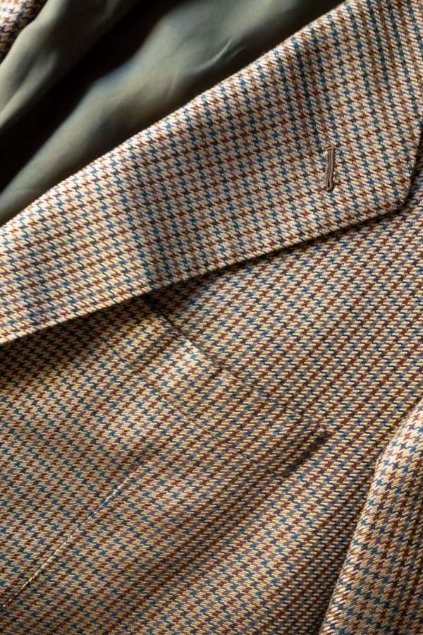 Blazer inglés vintage, con tejido a cuadros pequeños en tonos marrón, beige y azul.