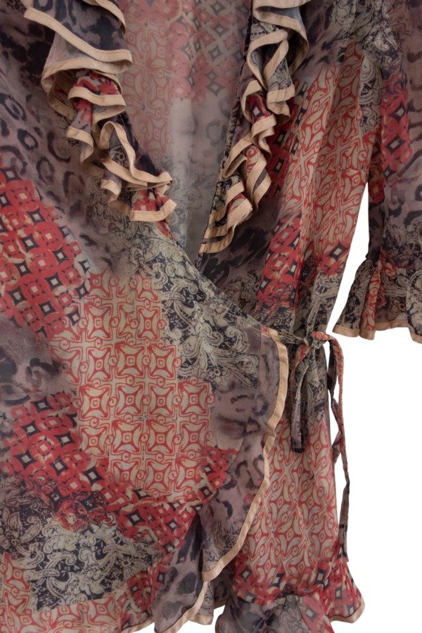 La blusa cierre con un cruce envolvente (wrap) que ajusta en el lateral con tiras, permitiendo adaptar la prenda al cuerpo. (foto 2)