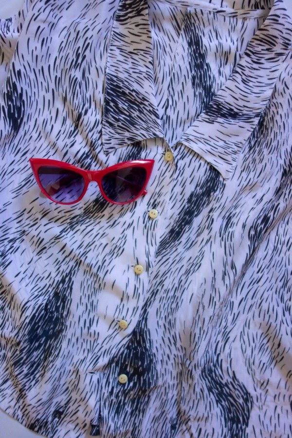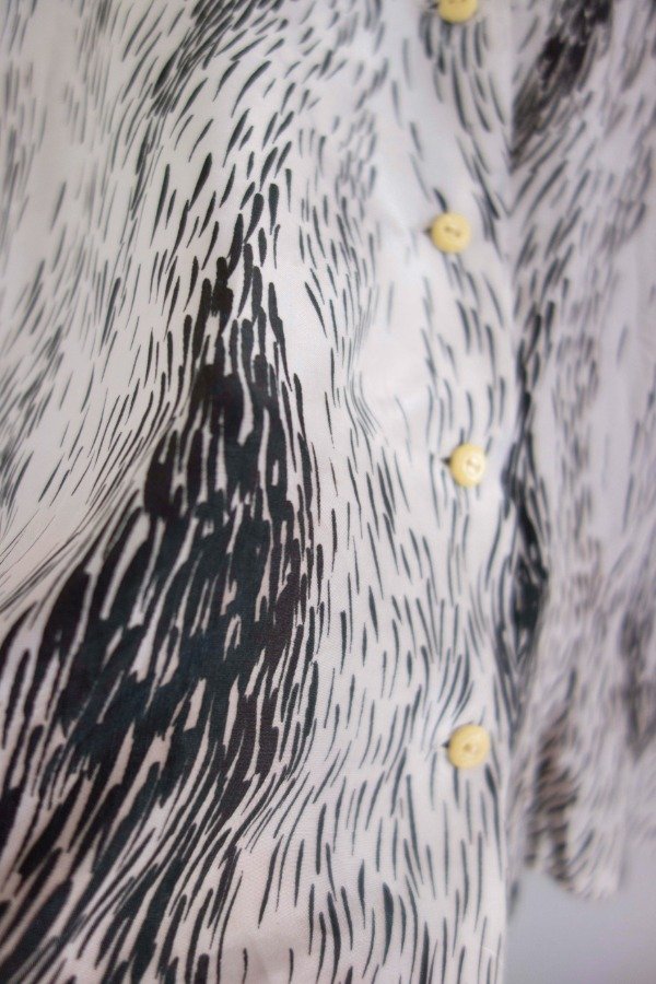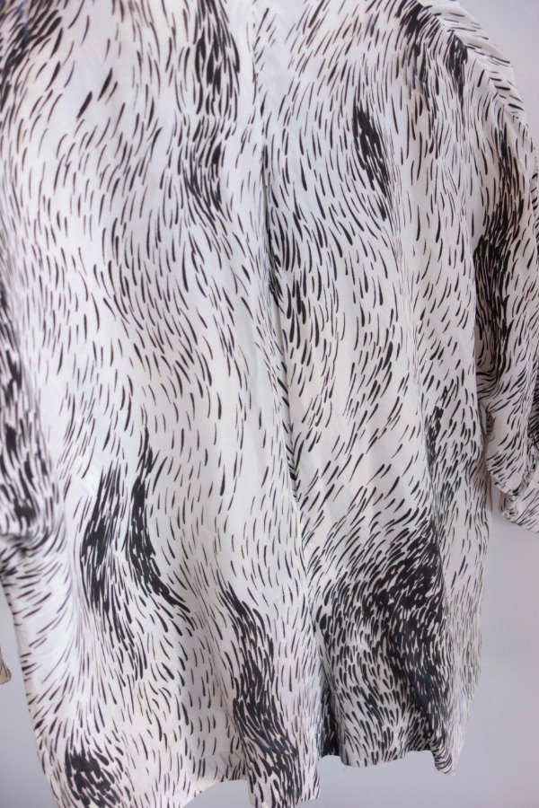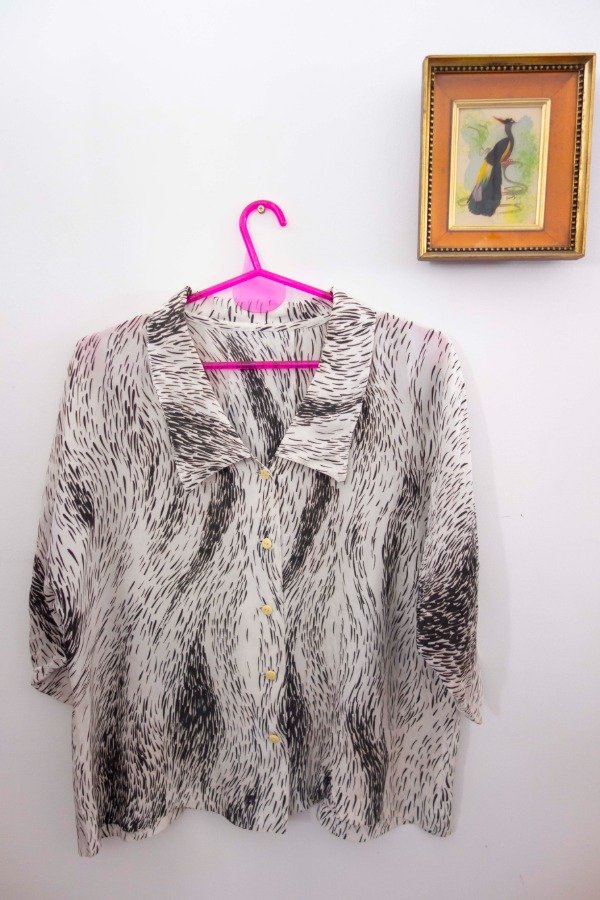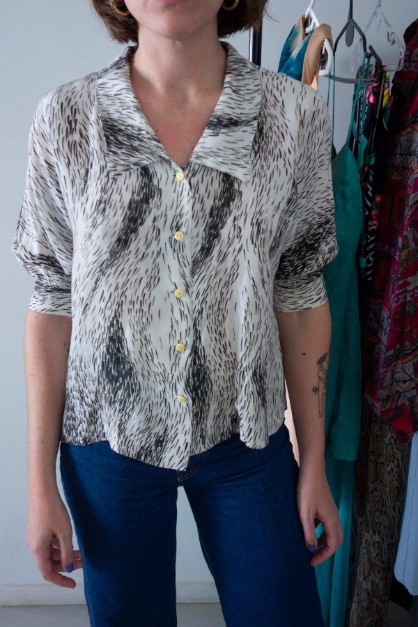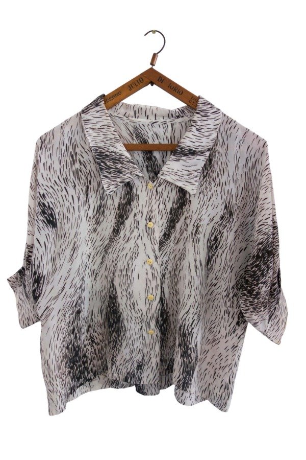 Camisa manga corta, de sedita estampada tipo animal print cebra en tonos blanco y negro.