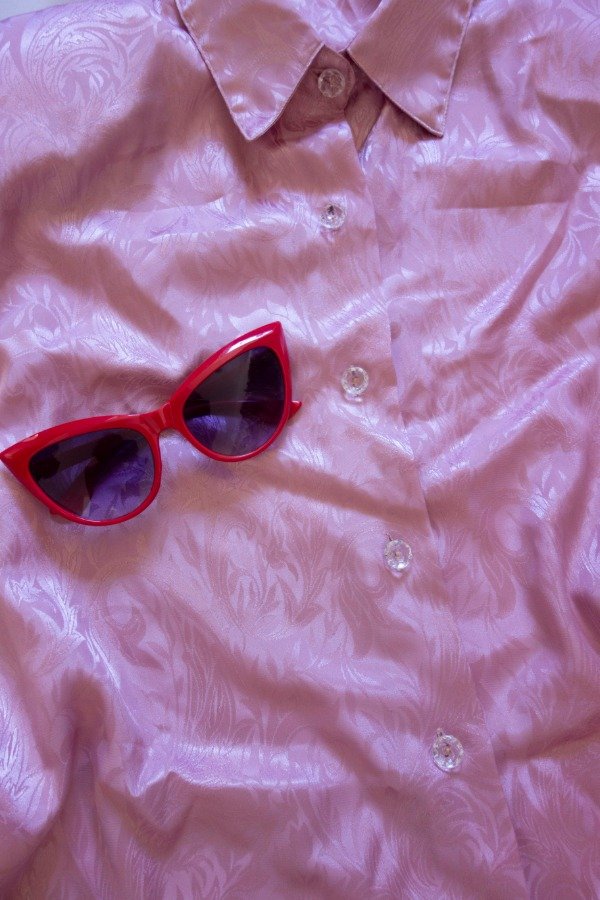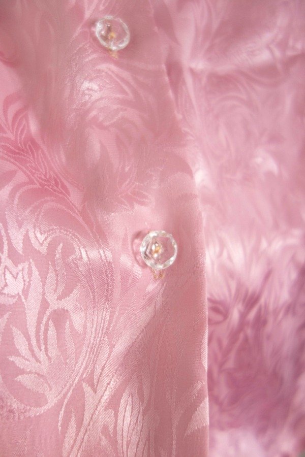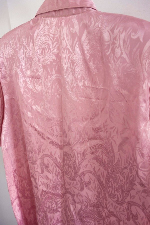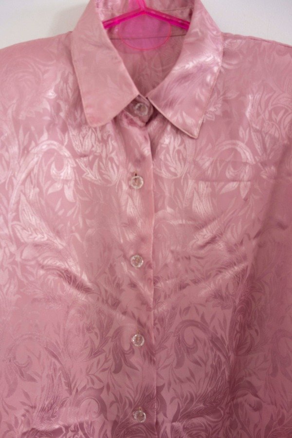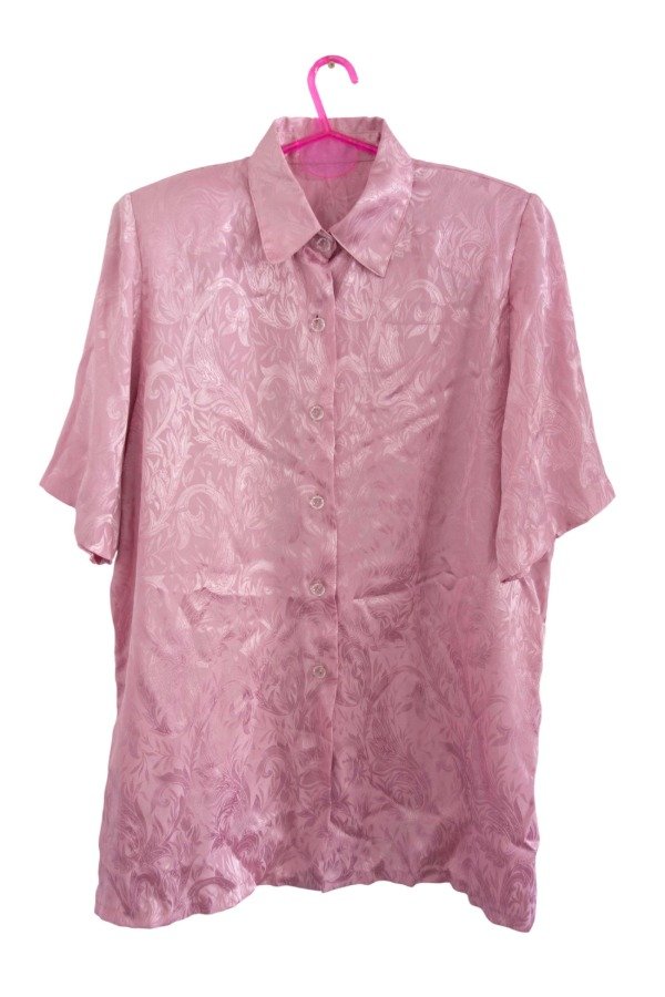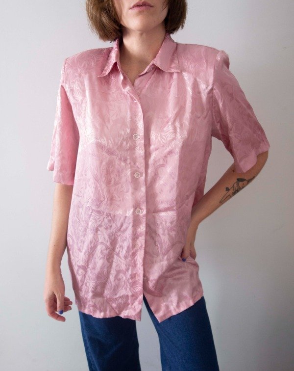 Camisa manga corta de sedita rosa con dibujos florales y arabescos.