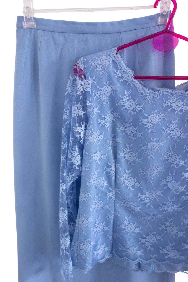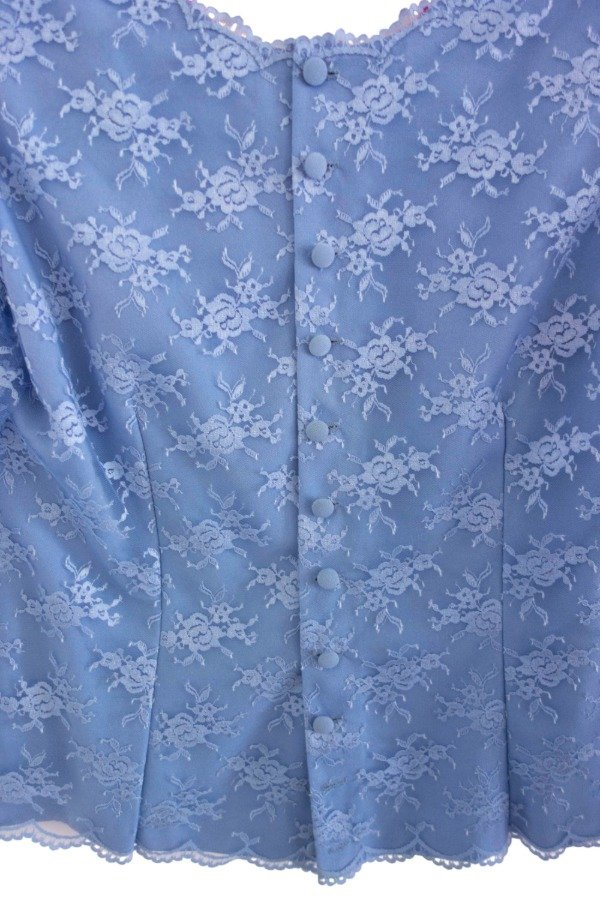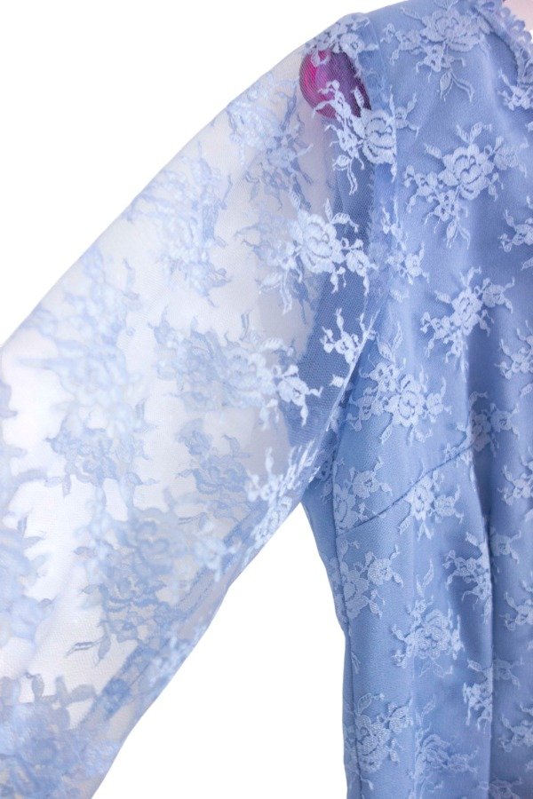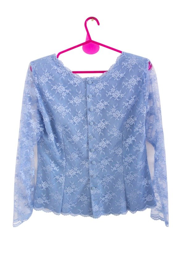 Camisa manga larga de encaje celeste, con cuello redondo y botones forrados en la espalda.