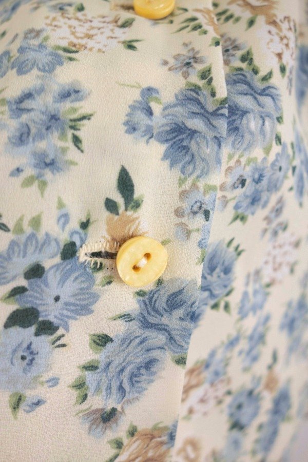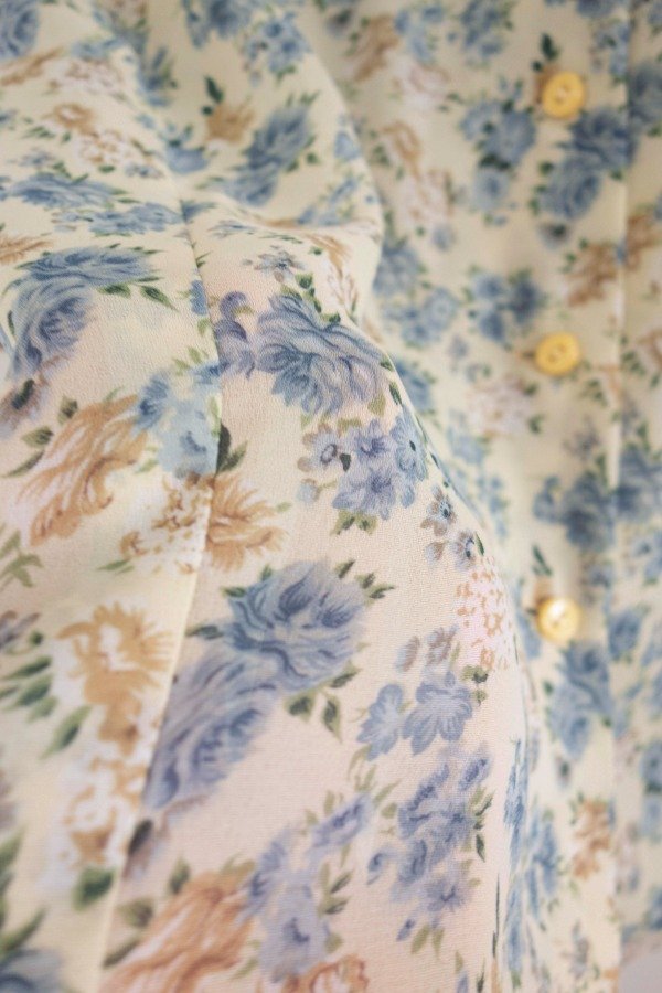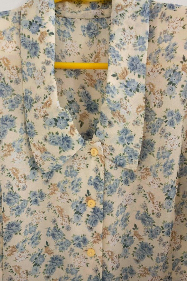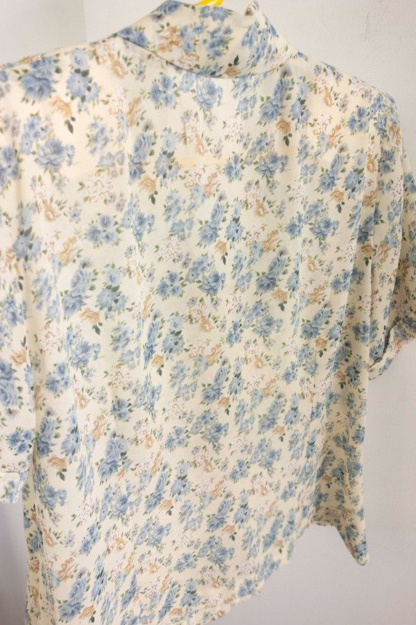 Camisa manga corta de gasa estampada en base cruda con florcitas celestes.