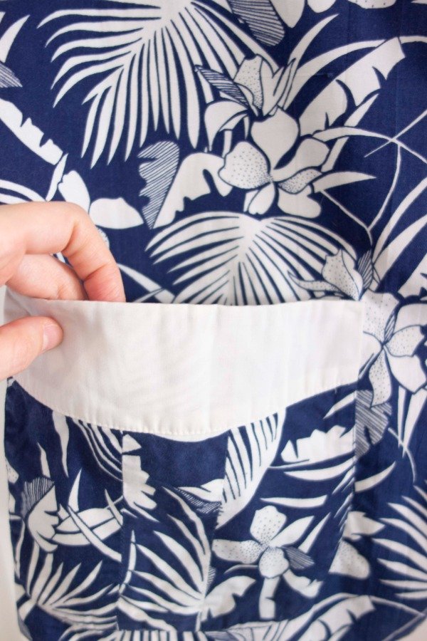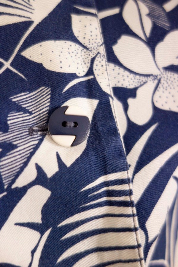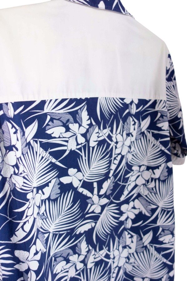 Camisa manga corta de poplin de algodón estampado en tonos crudo y azul, con recortes.