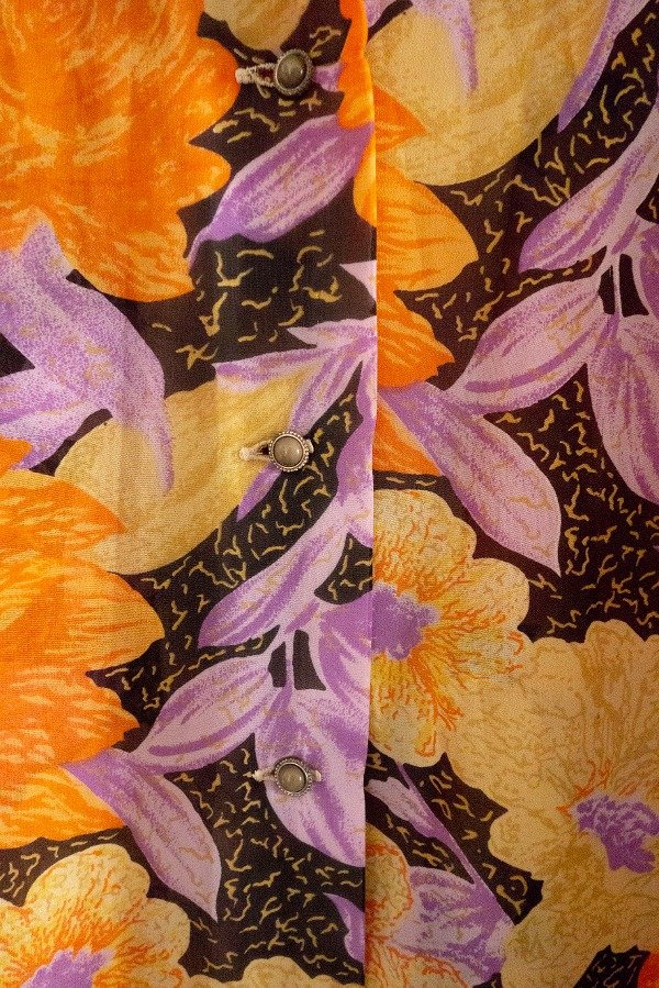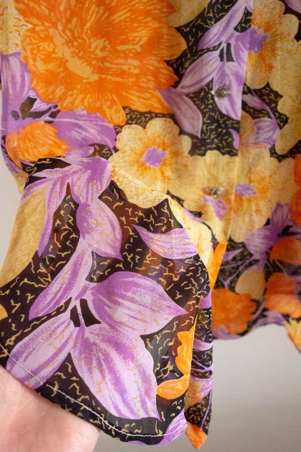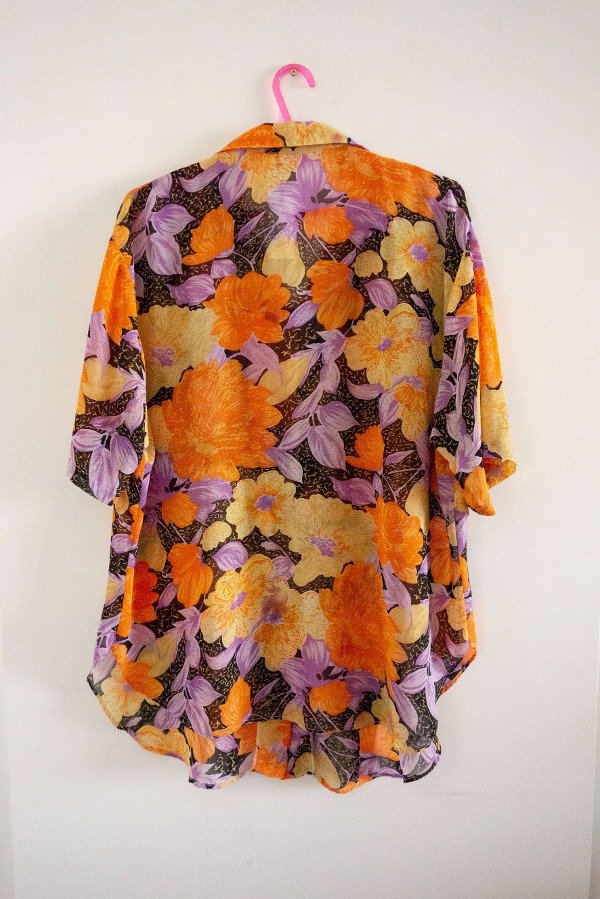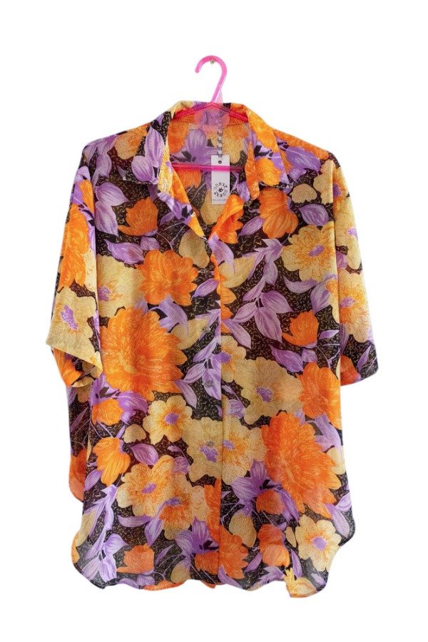 Camisa manga corta de gasa estampada en tonos naranja, lila, negro y amarillo.