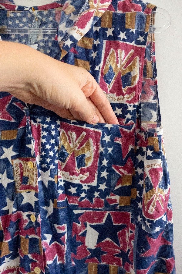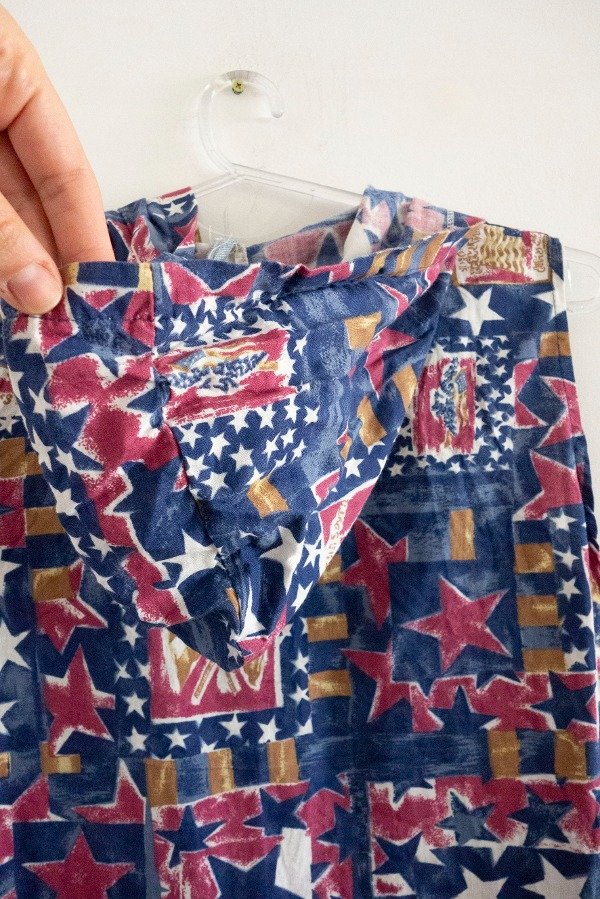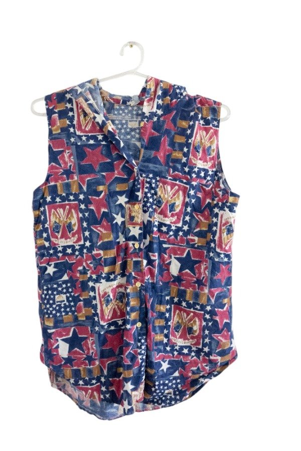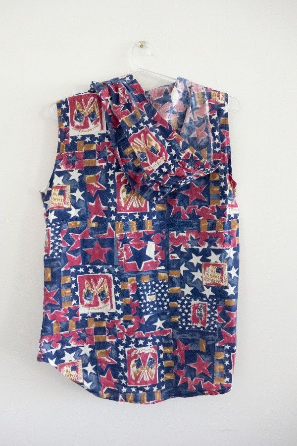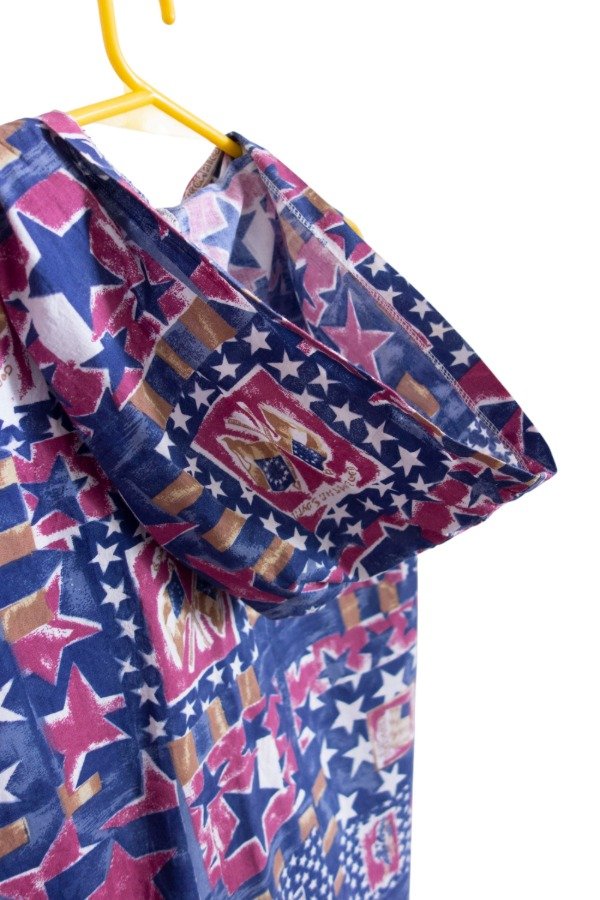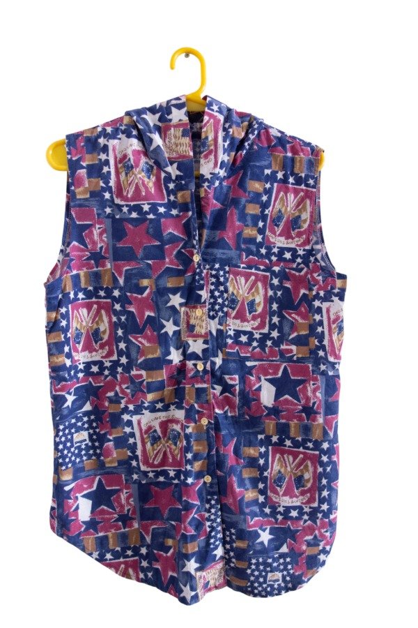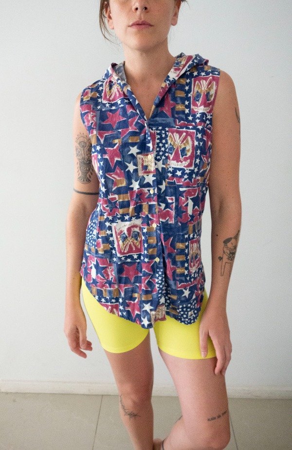 Musculosa con capucha de poplin estampado en tonos azul marino, bordo, camel y blanco.