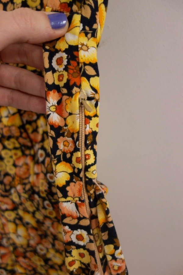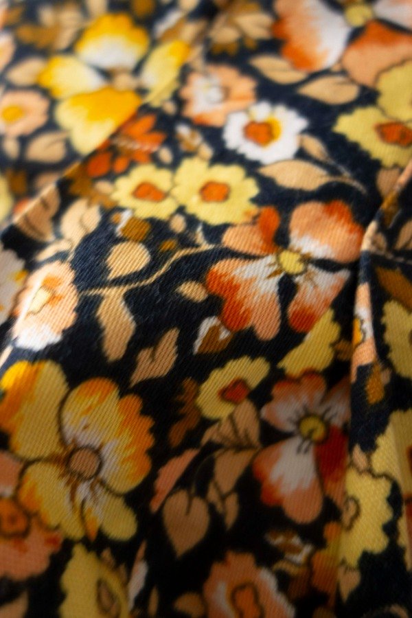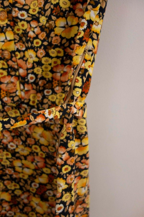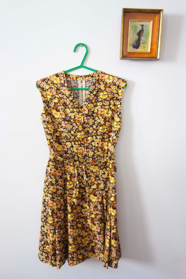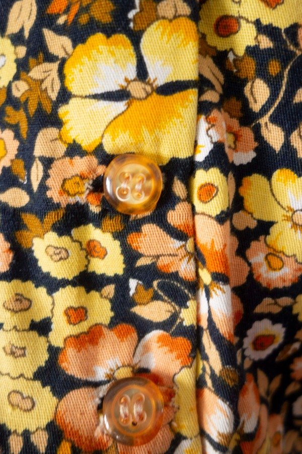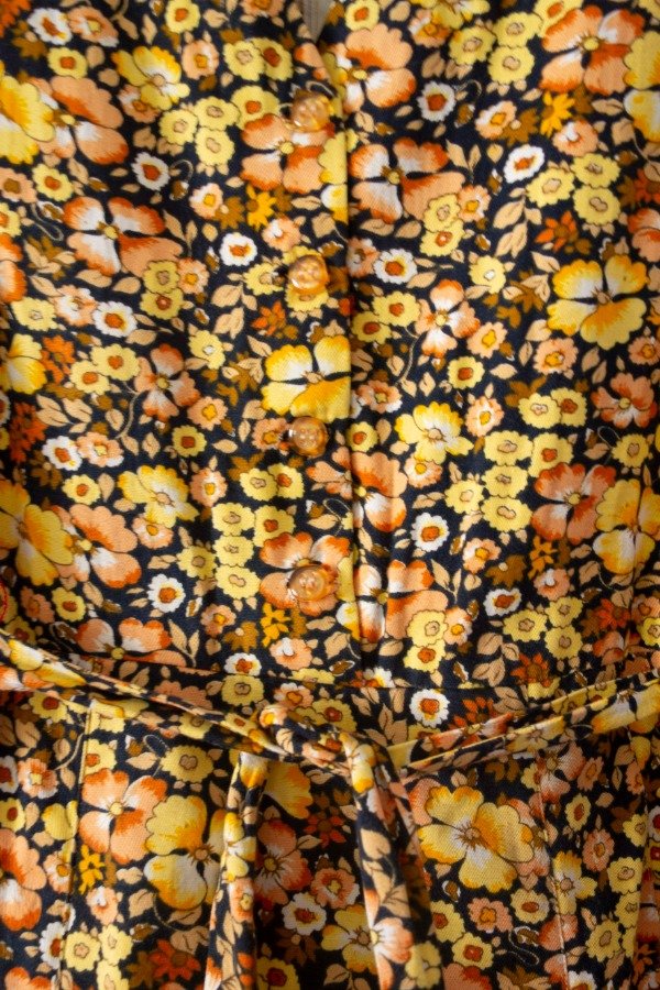 Vestido corto sin mangas con botones en delantero, de poplin de algodón gruesito con estampado floral en tonos amarillos.