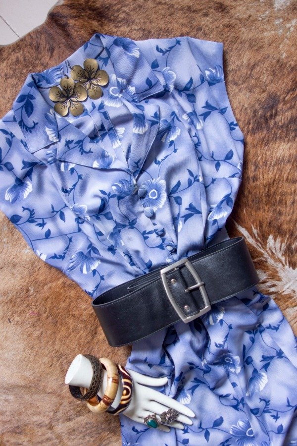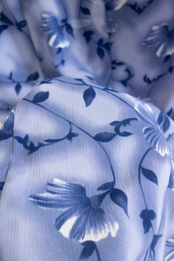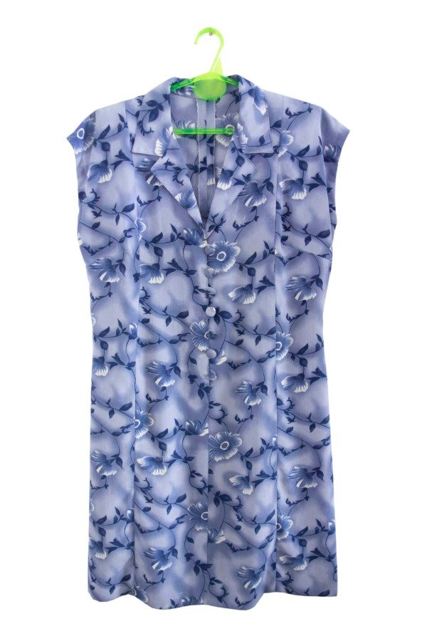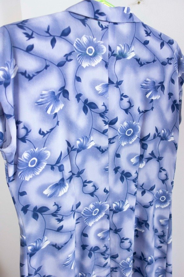 Vestido camisero de línea de creppe con estampa floral en tonos azules.