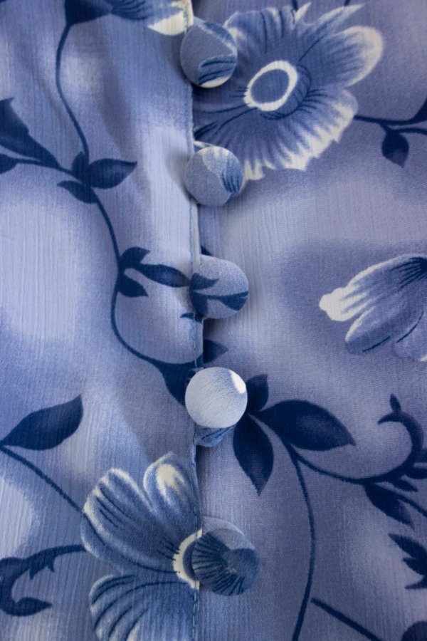 Cuello sastre y cierre frontal con botones forrados de la misma tela.