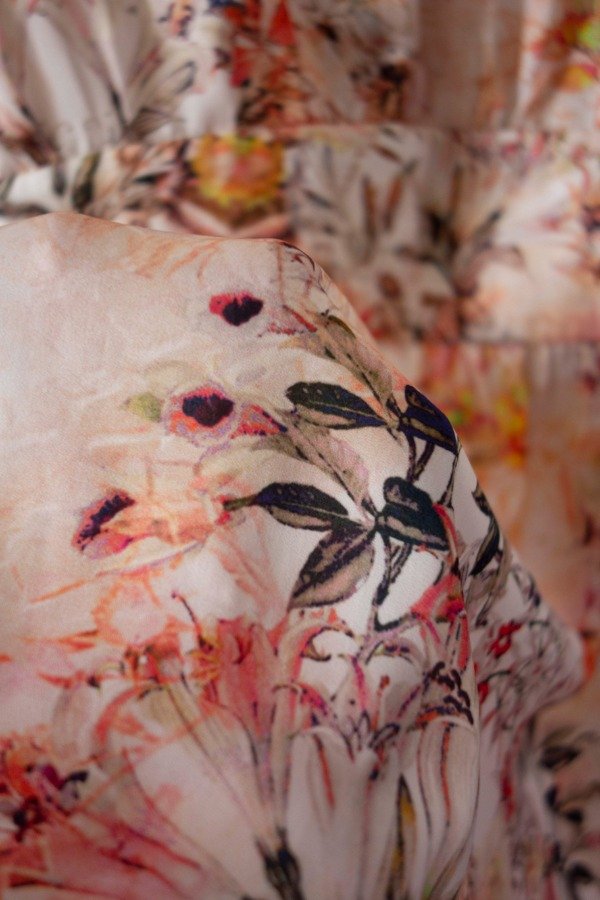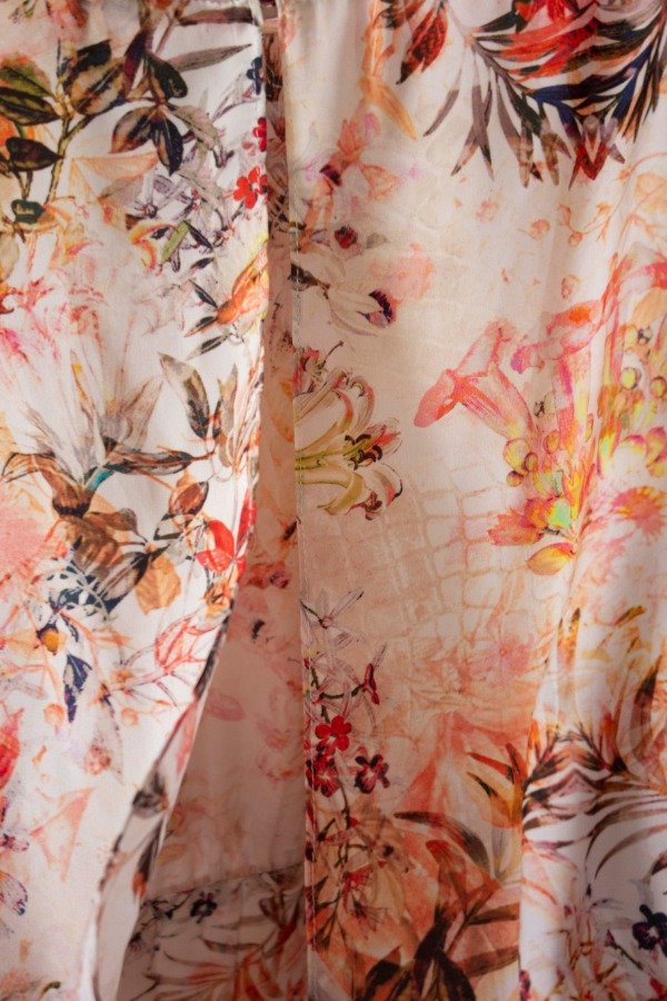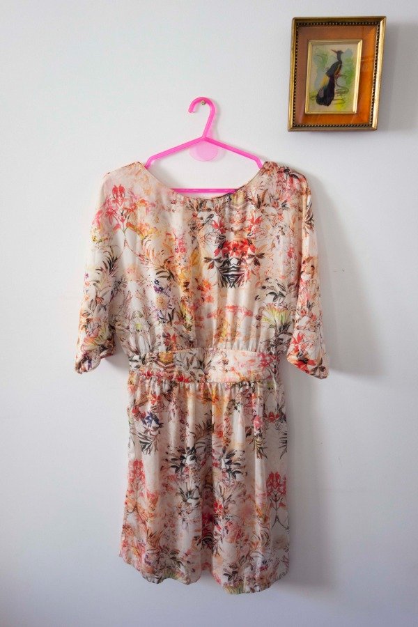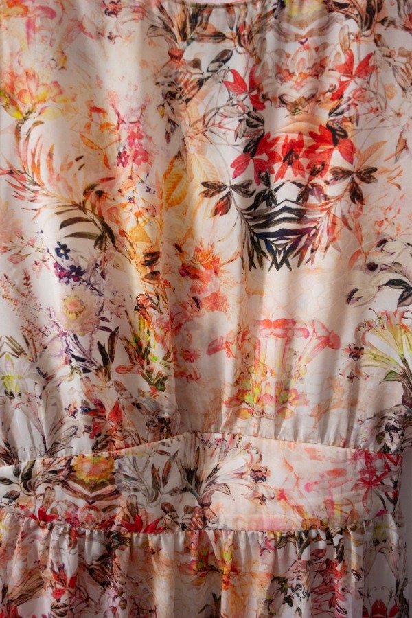Vestido corto manga murciélago, con escote bote, de sedita con estampado floral en tonos rosaditos.