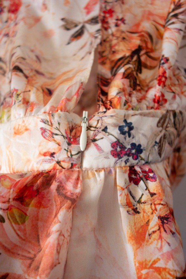 La falda es evasé, tiene vuelo, y cierre en la espalda.
